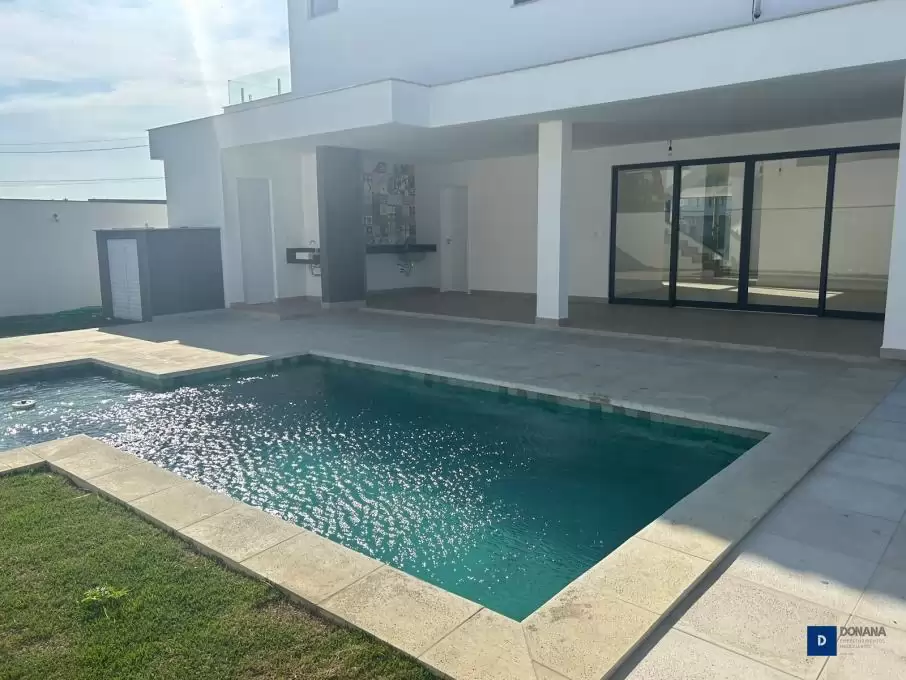 Outras informações: Acabamento de primeira qualidade em todos os detalhes. Piso 100% porcelanato. Escada em granito e corrimão em Blindex. Bancadas de granito com design e cores exclusivas em todos os banheiros, cozinha e área gourmet. Porta de entrada em madeira, com design personalizado e fechadura eletrônica de última geração. Esquadrias de alumínio cinza chumbo, vidros transparentes e telas mosqueteiro (Quartos e Sala de TV). Louças e metais de primeira qualidade. Piscina com revestimento atérmico nas bordas e pátio externo, revestimento interno em cerâmica com acabamento tipo Hijau e iluminação colorida.